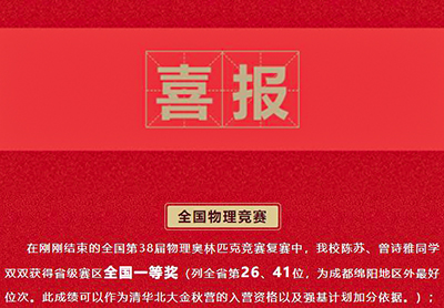 在剛剛結(jié)束的全國第38屆物理奧林匹克競(jìng)賽復(fù)賽中,我校陳蘇、曾詩雅同學(xué)雙雙獲得省級(jí)賽區(qū)全國一等...