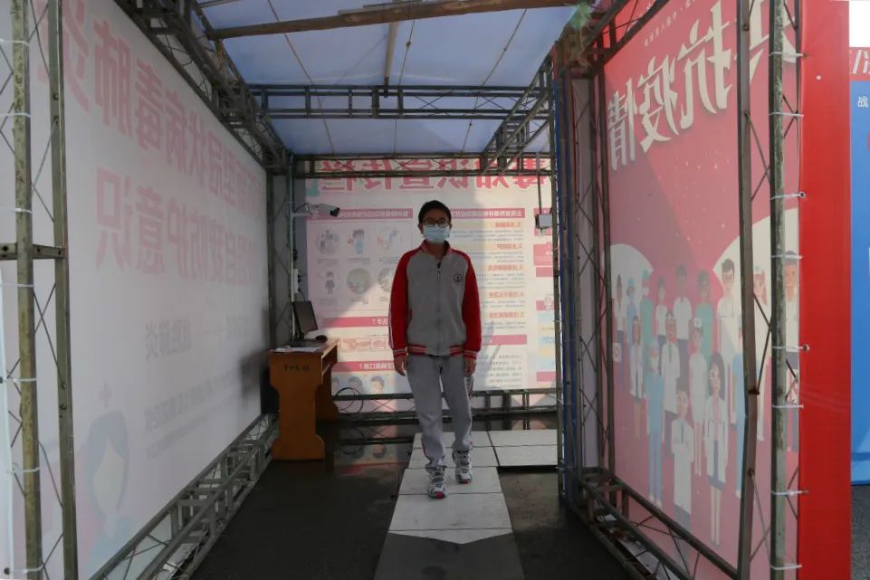 手續完備以后,符合條件的學生依次通過紅外線測溫儀第二次測量體溫。第一位學生通過紅外線測溫儀顯示體溫36.7,可以進入學校校園(家長返回)。