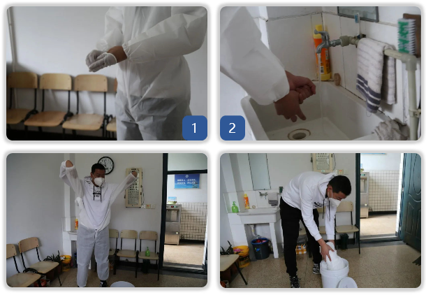 安全應急處置和引領負責人趙老師按照規定和程序脫掉和處理防護用品。