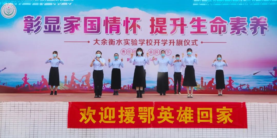 2020年4月9日,大余衡水實驗學校舉行了復學的第一次升旗儀式,全體教職員工相聚學校田徑場,1600余名學生在線同步觀看直播,以隔空參與的形式共同見證了這充滿紀念意義的升旗儀式。現場邀請了大余縣衛健委謝芳華副主任以及大余縣人民醫院腫瘤科王啟平主治醫師、內三科彭聯平主治醫師、中醫院王穎娟護士三位抗疫英雄代表參加此次儀式。