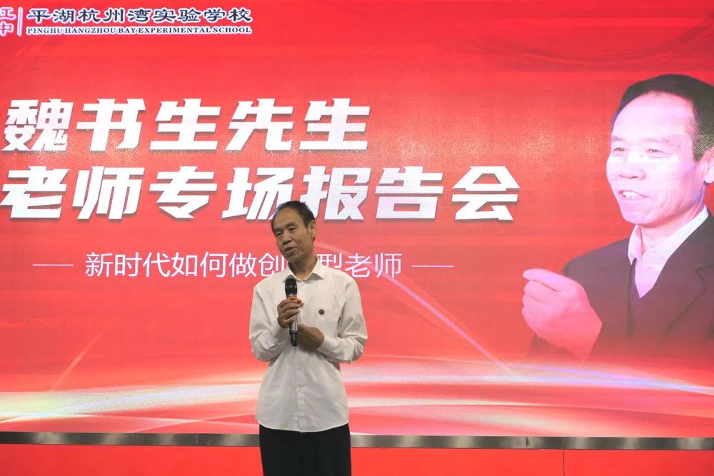 2020年9月15日上午,被喻為“穿西裝的孔子”的當代教育家魏書生來我校為全體教職工進行以“新時代如何做創新型老師”為主題的專場思想報告會。嘉興教育學院處長沈俊松先生,嘉興港區社發局文教衛副書記顧巧明先生,平湖實驗小學教育集團黨委書記、總校長芮金良先生,乍浦高級中學黨總支書記、校長曹躍平先生,平湖實驗小學教育集團副總校長、毓秀小學校長湯麗英女士,平湖杭州灣實驗學校理事長肖家興博士,北大親子教育專家孫一鳴老師,海寧市南苑中學、嘉興市城南中學、嘉興市運河實驗學校、嘉興市城南小學等學校,以及平湖市、港區兄弟學校的老師們紛紛慕名而來,聆聽長者教誨。