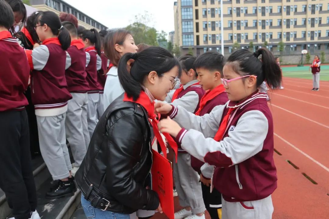 大隊輔導員宣布各中隊輔導員聘任名單,頒發聘書,大隊長為大隊輔導員佩戴紅領巾,紅色成了我們胸前最亮麗的色彩。