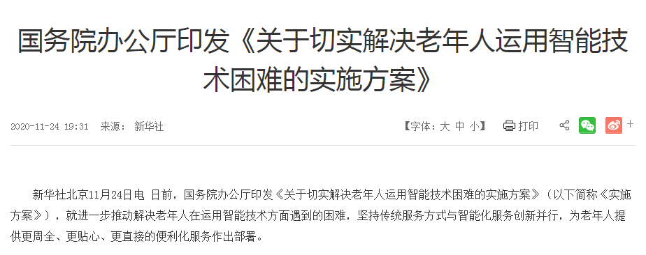 11月24日,國務(wù)院辦公廳印發(fā)了《關(guān)于切實解決老年人運用智能技術(shù)困難實施方案》的通知,要求各類日常生活場景中,必須保留老年人熟悉的傳統(tǒng)服務(wù)方式。