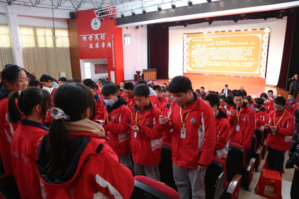 終于到了我校的傳統項目,班級互相迎戰與挑戰環節。全體初中部學子以年級為單位,每個年級三個班級為挑戰班,另三個班級為迎戰班,同學們用最激揚的聲音,念出最鏗鏘的誓詞。一時間,戰歌起,硝煙彌漫,大報告廳激情飛揚,聲如雷動,響遏行云,在校園內外回環激蕩,久久不能散去。