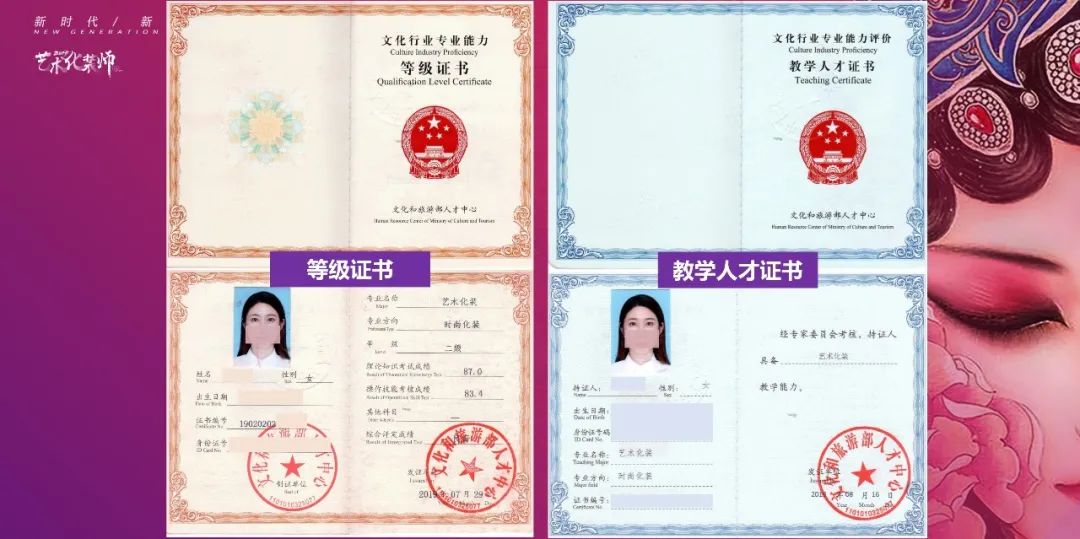 與以往的化妝師、美容師、美發師的技能證不同,藝術化裝師證是由國家文化和旅游部人才中心頒發的帶有國徽標識的職稱證,持證者會被納入國家專業人才信息庫,享有社會職稱等福利待遇。同時,雙師證即意味著你可以從事藝術化裝的教育工作。